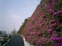 しかし… 歩道はまだ多くの部分が工事中で、舗装はされているものの、かなりデコボコしているため、自転車は特に走りにくい。 ![]() 環境に配慮しているということだろう。本線はトンネル化されてほとんどの車はそちらを走り、側線は地上を通っているものの歩道との間には透明の遮音壁。切り通し部分にはつつじが植えられていた。 |