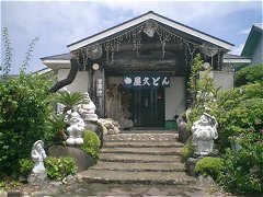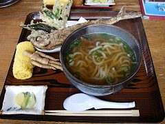 昼食はトビウオまずは昼食のために港近くのうどん屋さん?に入る。 頼んだのは「飛唐うどん」。トビウオ(飛魚)が名物らしく、そのすり身の入ったうどんに、トビウオの唐揚げがセットになったものだった。1300円とけっこういい値段だ。出てきたトビウオの唐揚げの大きさにビックリ。 |