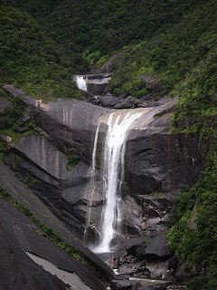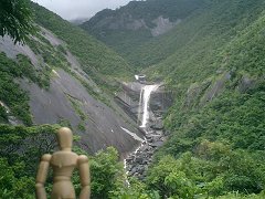 千尋の滝ホテルに向かう途中にあった、千尋の滝(せんぴろのたき)に行く。 解説によると400m×200mもの花崗岩の一枚岩のくぼみを流れ落ちているのだそうだ。かなりスケールが大きいが、展望台から距離があるので、ちょっと実感しにくい。 雨が突然降ったり止んだりしている。 |