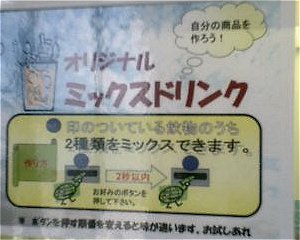 砂むし会館に、こんな自動販売機を見つける。 ぱっと見たところ普通の自動販売機だったが、なにやら注意書きみたいなものが… 2種類の飲み物を混ぜることができるという機能らしい。居酒屋とかカラオケボックスなんかで、ふざけて作ることはあっても、自動販売機で、勝手に混ぜた飲み物を作ることができるなんて初めてだ。試してみたい気もしたが、帰りのバスがすぐに帰そうだったので、残念ながら断念。 |