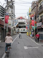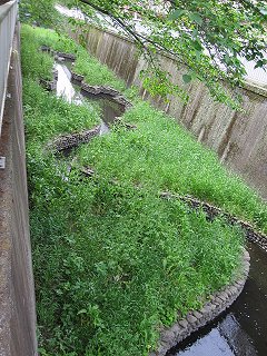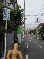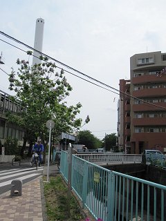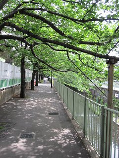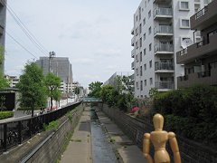 環七通りと交差する。川沿いの遊歩道を遮る通りに、珍しく横断歩道があった。たいてい、横断歩道は川から離れた場所にあることが多い。このように、最短で通りを渡れるとありがたい。 |