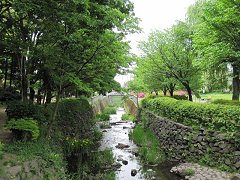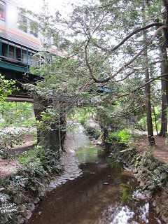 明確な起点を示す標識を見つけずに出発してしまったが、雰囲気としては、池の一部から水が流れ出てるといった感じ。 水の量も極めて少なく、さらさらと流れている。 その上を京王の井の頭線が、終点の吉祥寺駅に向かって走っていった。 |