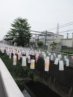 さっき神田川の上を越えていった京王の井の頭線が、寄り添うように近づいてきた。 周囲すっかり住宅地だが、川の周囲は開けている。 しばらく進むと、川の上になにやら白くぶらさがるものが… 「神田川こいのぼりまつり」(キャッシュ)というイベントの企画らしく、手作りのこいのぼりだった。 |