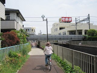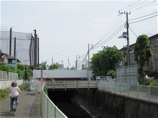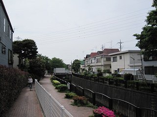 ふたたび川沿いを走る神田川が、三鷹台駅の真ん前を流れていることもあって、橋のように道路で蓋がされているのため、川から外れて走るが、すぐにまた川沿いを走ることができるようになった。 |
