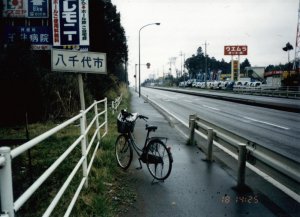 千葉県船橋市(18日 14:01) あともう少しで船橋というところで、恐れていた事件発生。どうも自転車のタイヤの調子がおかしいぞと、タイヤを見てみると、空気が抜けている。パンクだった。しかし、写真を見ての通り、この付近、国道16号線沿線に自転車屋らしい店は見つからず、しばらくさまようことになる。結局電話ボックスを探して、タウンページの助けを借りた。 |