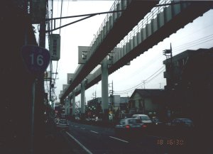 千葉県千葉市(18日 16:30) ついに千葉市へ。国道16号線の上をモノレールが走る。さすが、政令指定都市だ。写真はちょっと見づらいけど・・・ここへ来て、今日はどこに泊まる?か悩む。この先に行くとあまり大きな街がないので、選択肢が少なそうなことや、午前中雨も降ったせいか体力が消耗していたことなど考えて、千葉市のカプセルホテルに泊まることにした。 |