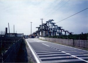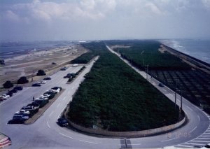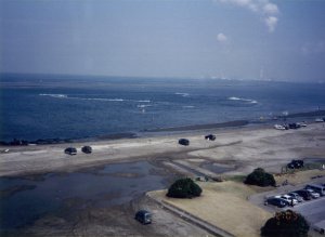 千葉県富津市(19日 11:59) 国道16号線の道なりに、そのまま進んでいくと、なんとそこは巨大な展望台だった。 展望台に上ってみると、まさにここが先端であり、国道16号線の起点・終点にふさわしいと感じた。 遠くにランドマークタワーもかすんで見える。明日の今頃はあの付近にいるのだと思うと、不思議な気がしたし、一瞬めまいも感じた。 |