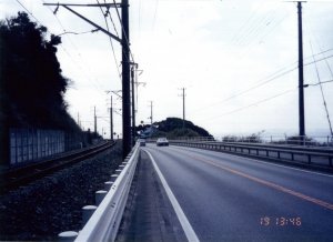 19日 13:46 どこだかよくわからないが、海沿いをひたすら走る。 左に見える線路は、JR内房線。 |