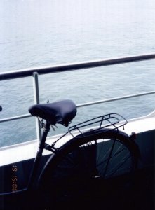 東京湾(19日 15:06) 一応、ママチャリだって立派な車両なので、堂々とフェリーに乗り込む。わずか30分足らずの旅。この旅で唯一座りながら先に進める区間だ。 |