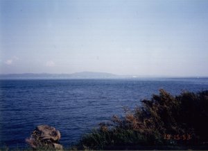神奈川県横須賀市(19日 15:53) 振り返れば、東京湾を一望できるところに来た。遠くにさっき乗った、フェリーの姿があった。 さて、国道16号線はどこにあるのか? |